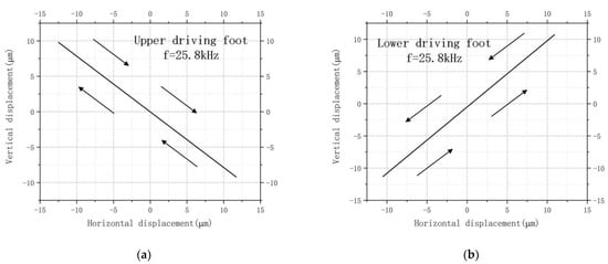As shown in Figure 8, the trajectories of the driving feet movements on both the upper and lower surfaces were oblique straight lines. The arrows were used to indicate the direction of motion. The maximum horizontal displacement of the driving foot on the upper surface was about 12.5 μm, and the vertical displacement was about 9.8 μm. The maximum horizontal displacement of the driving foot on the lower surface was about 10.9 μm, and the vertical displacement was about 11.3 μm.