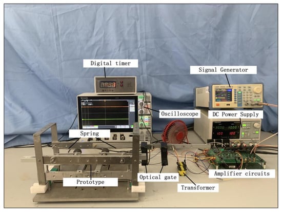 An ultrasonic motor test rig based on an isotropic eccentric constraint was designed and built, as shown in Figure 11. A DC power supply was used for conversion, and the resulting high-frequency AC voltage was transmitted to an oblique piezoelectric ceramic for excitation. After a PCB board was closely bonded to the piezoelectric ceramic on both sides of the motor, the motor was fixed to the platform using a rigid aluminum bar to realize the fixation of both ends of the motor. Then, the motor was mounted and fixed to the platform using a solid aluminum bar with high hardness. The sliders and driving feet were in full contact without any gap. An oscilloscope was used to observe the phase difference of the AC voltage applied on both sides of the motor. The driving speed of the motor was measured by recording the time of the kinematic passing through the photogate. On the experimental platform, the end oblique piezoelectric ceramic was used for fixation and excitation, and there was only one driving foot on each of the upper and lower surfaces. Due to the strength of the oblique ceramic, the bonding of the ceramic to the elastomer, the end fixation of the ceramic, the horizontal balance of the slider, and other process reasons, preload was applied in the prototype using gravity with a preload of approximately 1.3 N.