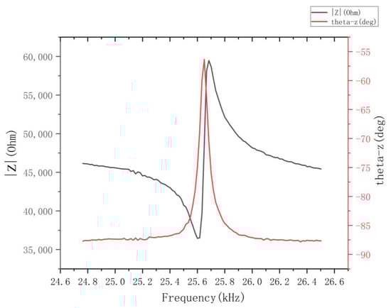 The impedance analyzer was used to test the impedance characteristics of the stator, and the frequency range of the scan was selected to be 20 kHz to 30 kHz; the impedance characteristics of the stator were obtained, as shown in Figure 12. They were end-bound by means of aluminum bars.