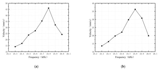 The ultrasonic motor used in this paper was excited by the high-frequency alternating current, with a 180° phase difference between the two sides of the voltage, so changing the input AC voltage frequency would affect the polarization of the piezoelectric ceramic. After the prototype was made, the operating frequency of the motor and the simulation were inaccurate due to the manufacturing conditions and process, so the voltage V = 600 V, and the driving speeds of the two driving feet on the upper and lower surfaces were studied at different frequencies to verify the working performance of the motor. The test results are shown in Figure 13.