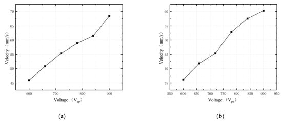 Based on the inverse piezoelectric characteristics of oblique piezoelectric ceramics, it is known that as the excitation voltage rises, the stronger the motor stator vibration and the larger the amplitude. Thus, the driving force applied to the kinematics by the stator driving foot under a certain preload is greater, resulting in a faster motor output kinematic operation. In light of this principle, to achieve the relationship between motor driving speed and voltage amplitude under the same frequency of AC voltage, 25.8 kHz was selected as the operating frequency of the motor, and the upper and lower surface driving feet worked separately. The voltage amplitude multiplier was expanded to measure the motor driving speed. The experimental results of the two driving feet are shown in Figure 14.