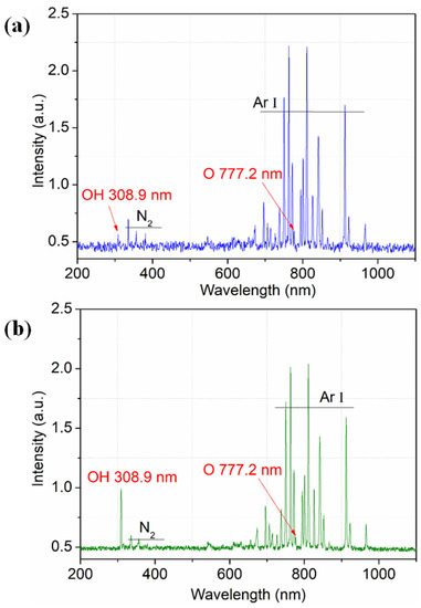 To investigate the presence of reactive species generated in the plasma plume, the typical optical emission spectra of pure Ar and Ar/H2O microplasma jets are shown in Figure 3. Both the applied voltages were kept at 12.8 kV, and the water vapor content for the Ar/H2O microplasma jet was kept at 0.2%. It can be seen that both the spectra were dominated by neutral Ar atoms (Ar I) lying in the wavelength ranging from 700 to 850 nm. Due to the fact that the plasma was generated in open-air conditions, reactive O atoms at 777.2 nm, OH radicals at 308.9 nm and molecular nitrogen spectral bands in the range of 330 to 420 nm were also detected in both the pure Ar and Ar/H2O microplasma jets. These reactive species mainly came from the inelastic electron-impact collisions or the collisions between the Ar* and the O2 or water vapor in the ambient air, especially for the pure Ar microplasma jet [23]. When a certain amount of water vapor was introduced into the plasma, it could be clearly seen from the spectrum that the OH intensity increased in the Ar/H2O microplasma jet. The possible reaction pathways to generate the OH radicals are listed as Reactions (2)–(6). It can be concluded that the OH intensity is mainly dependent on the water vapor molecules and the electron density [24], and it plays an important role in polymer surface modification.