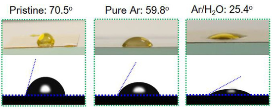 The hydrophilicity of the PI films was evaluated by water contact angle (WCA) measurements. Figure 5 presents the WCAs of an untreated PI film and the films modified by the pure Ar and Ar/H2O microplasma jets with an applied voltage of 12.8 kV and a water vapor content of 0.2%. The WCA of the pristine PI surface reached about 70.5°, and this value decreased to 59.8° after processing with a pure Ar microplasma jet for 60 s. When 0.2% water vapor was introduced into the plasma, the WCA of the PI surface further decreased to 25.4° with the same plasma treatment time. This confirms that the surface hydrophilicity of the PI film was greatly improved after the microplasma jet modification, and the addition of water vapor was beneficial for further improvement.