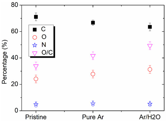 Relative percentages of C, O, N and O/C of pristine, pure Ar and Ar/H2O microplasma-jet-modified PI films.