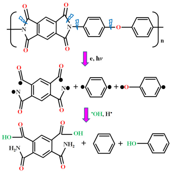 The modification mechanism of a PI film surface by an Ar/H2O microplasma jet was discussed in this work through the interaction process between the PI surface and the plasma. From the results of the physical morphologies and chemical compositions of the PI films after plasma modification, it could be seen that the reactive and excited particles, free electrons contained in Ar/H2O microplasma, bombarded the molecular chains on the PI film surface, resulting in cross-linking and etching on its surface, and finally introducing diverse oxygen-containing reactive functional groups on the PI surface [34]. Figure 11 demonstrates the reaction processes on the PI surface during microplasma jet modification. Because the C-N bond and C-O bond in the PI molecular chains are weak, they will be broken first under the action of electrons and ultraviolet photons in the plasma [35]. These broken molecular chains then react with O atoms and OH radicals in the plasma to further form new functional groups, such as -NH2 and -C=O-OH.