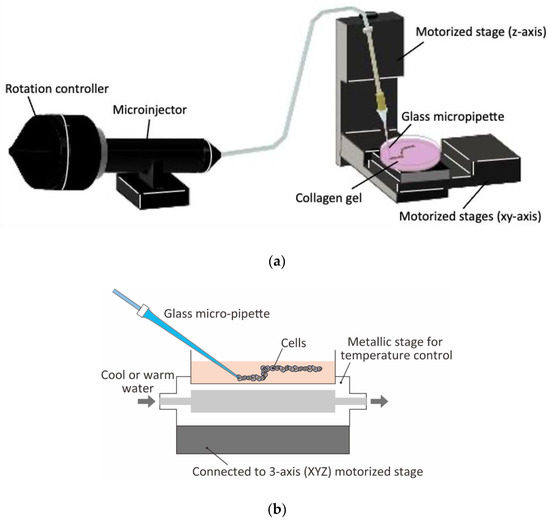 Micro-injection and three-dimensional position control system for three-dimensional cell drawing. (a) Experimental setup consisting of micro-injector and 3-axis motorized stages, (b) temperature control of system for collagen sol/gel.