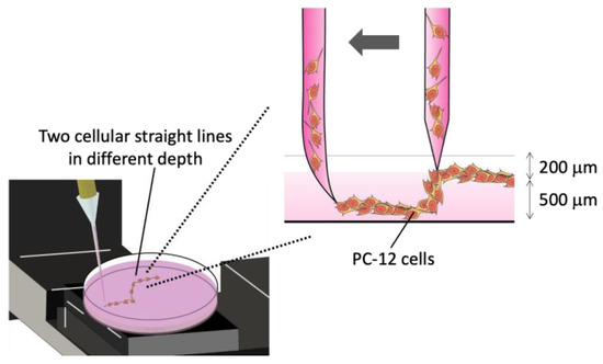 Following the preparation of collagen hydrogels in petri dishes, PC-12 cell suspension was dispensed in the gel to draw two straight lines of different depth (Figure 2). At first, the tip of glass micro-pipette was positioned at the depth of about 200 mm from the gel surface. Secondly, the tip was moved horizontally to draw a 10 mm straight line with dispensing cell suspension, descended for vertically for 500 mm, and moved horizontally to draw a 10 mm straight line with dispensing the cell suspension. The rate of tip movement was set at 500 mm/s and dispensing rate of cell suspension was set at 0.192 μL/s. After cell drawing, the cell-patterned collagen gels were cultured for 4 days in the neuronal differentiation medium. At the end point of culture, day 4, the difference in focal point position of each cellular straight pattern and geometry of cellular patterns were evaluated by a phase-contrast microscope (TE-2000, Nikon, Tokyo, Japan) attached with a focus controller (MSS-FC, Chuo Precision Industrial, Tokyo, Japan).
