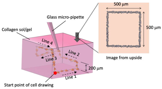 As shown in Figure 3, the tip of glass micro-pipette was positioned in the depth of 1 mm from the gel surface. Next, the tip was moved along with x-axis for 500 mm (Line 1), elevated along with z-axis for 200 mm, moved along with y-axis for 500 mm (Line 2), elevated for 200 mm, moved along with x-axis for −500 mm (Line 3), elevated for 200 mm, moved along with y-axis for −500 mm (Line 4), and descended for 600 mm to reach the start positions. During the drawing of the square pattern, the tip was moved at the rate of 500 mm/s and the cells suspensions was injected at the rate of 0.192 μL/s.