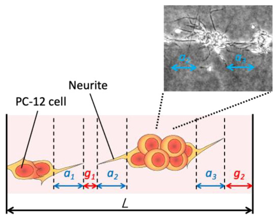 For the fundamental validation of our proposed method, the construction of neuronal cell network was evaluated from phase-contrast microscopic images. Neuronal differentiation and network formation were evaluated by image-based analysis. Neuronal differentiation of PC-12 cells could be evaluated by the neurite generation [27,28]. In this study, the length of neurite, a, was defined and measured as the length of neurite connecting the adjacent cell aggregates (Figure 4). The gap length of cellular patterns, g, was also measured. Both measurements were performed in each side of square pattern. Rate of total neurite length and continuity of cellular pattern, N and C, were calculated as follows;
