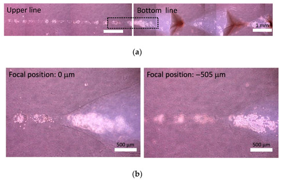 Phase-contrast images of straight lines at different depth in atelocollagen gel. (a) Gross images of upper and bottom lines, (b) enlarged images at different focal positions indicated by dashed line in the gross image.