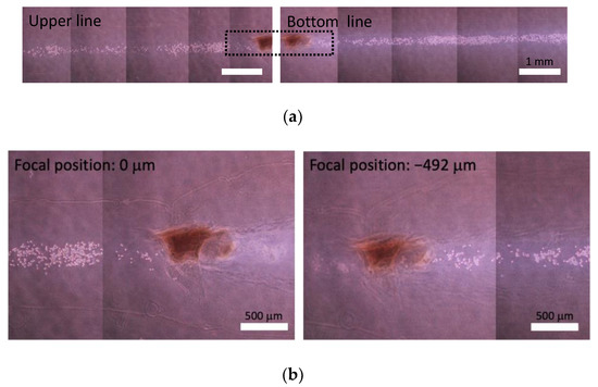 Phase-contrast images of straight lines at different depth in native collagen gel. (a) Gross images of upper and bottom lines, (b) enlarged images at different focal positions indicated by dashed line in the gross image.