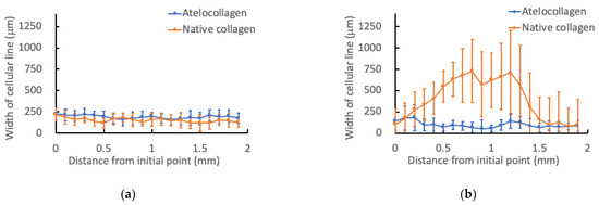 Width of cellular lines in collagen gels at (a) upper and (b) bottom lines. Mean ± S.D., n = 10.