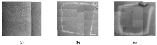 To determine an appropriate gelation condition of collagen gel, the three-dimensional cell drawing experiments were performed under different gelation temperature. At lower temperature, 25 °C, the square pattern of cells was not maintained and cells were dispersed during the cell injection in collagen gel (Figure 8a). The square patterns could be formed and maintained in the collagen gels gelled at over 30 °C (Figure 8b,c). The square pattern of cells could be formed without crack or scratch by the tip of glass micropipette at 30 °C, whereas the cracks and scratches were observed in the pattern at 35 °C.