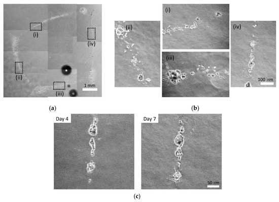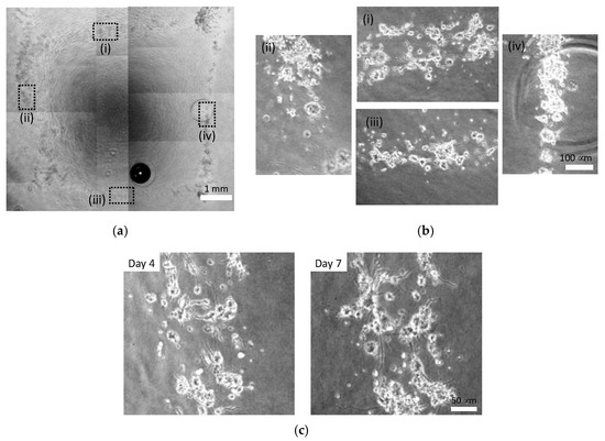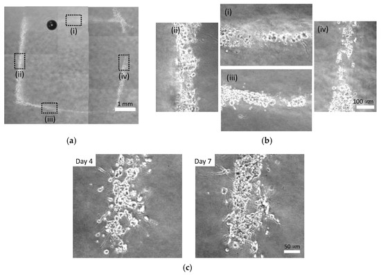 Phase-contrast images of square pattern of PC-12 cells injected at 0.480 mL/s in atelocollagen gel. (a) Gross image, (b) enlarged images of (i) Line 1, (ii) Line 2, (iii) Line 3 and (iv) Line4 of square pattern on day 7; (c) Neurite growth during the culture time.