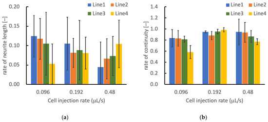 Rate of neurite length in each cellular line tended to increase with a decrease in the depth of line within square pattern made at injection rate of 0.096 mL/s, whereas tended to decrease in the pattern at the injection rate of 0.480 mL/s (Figure 12a). The rate of neurite length in each line of square pattern was similar when the cellular pattern was made at the injection rate of 0.196 mL/s. The rate of continuity in each cellular line tended to increase with a decrease in the depth of line within square pattern made at injection rate of 0.096 and 0.480 mL/s (Figure 12b). The rate of continuity in each line of square pattern was also similar when the cellular pattern was made at the injection rate of 0.196 mL/s.