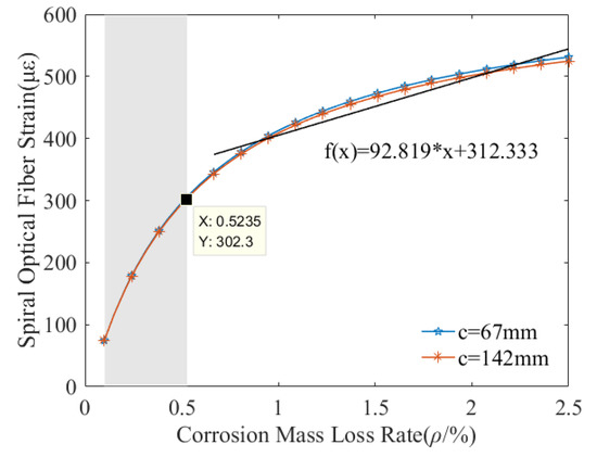 23], which contributes to the corrosion rate threshold. This reason is that the corrosion product used to fill porous area offsets the corrosive force, simultaneously alleviates the strain from a distributed sensor. Likewise, as more rusts are produced and accumulated at the concrete-steel interface, the expansive strain begins to increase until the corrosion products generate a compress on the surrounding concrete. Consequently, more corrosion products generate an expansive strain causing a distributed fiber deformation. Then the corrosion rate threshold is in turn increased.