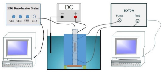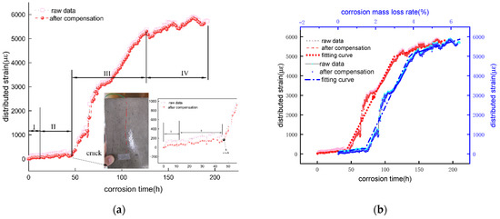 Figure 12a) after continuing to carry on the corrosion experiment. It is also found that the influence of the factors such as current adjustment and sealant leakage on the fiber strain before the crack of concrete are eliminated after temperature compensation(