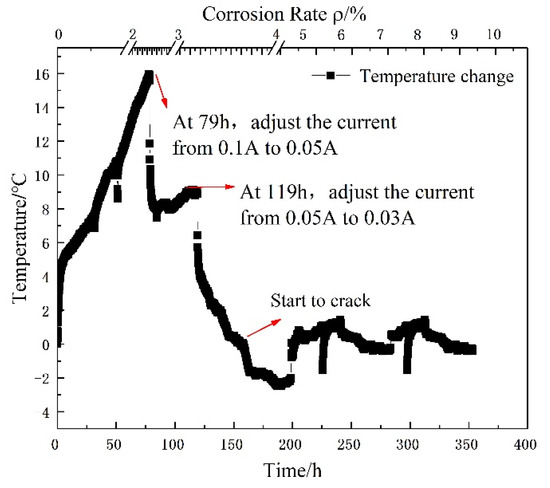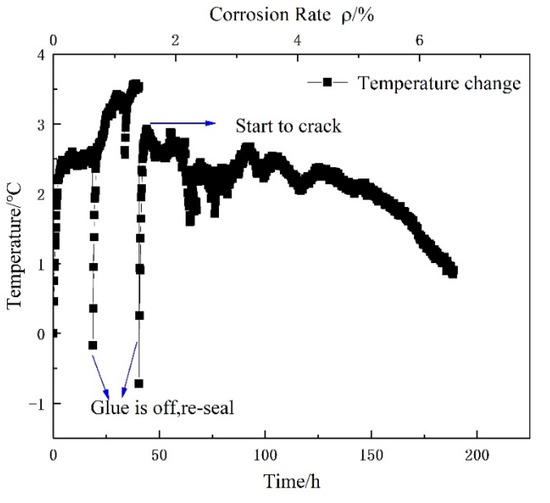 Meanwhile, the distributed expansive strain at the initial stage of specimen corrosion (about 0~40 h) after temperature compensation fail to be generated. The called corrosion rate threshold is about 1.34%, and cracking occurs at 160 h close to the observed cracking time of 155 h. The error is approximately 0.14%. Additionally, the distributed strain depends on a rising ambient temperature induced by the electro-accelerated corrosion.