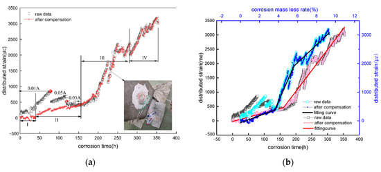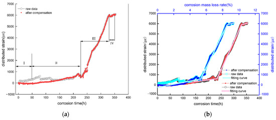 Figure 13a indicates the relationship between corrosion time and the distributed strains from the distributed sensor located in steel bar layer and mortar layer of specimen 2-300#. At first 2 h, the raw strain wrapped on the steel bar layer and the mortar layer increases rapidly to 200