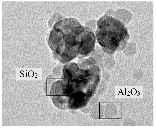 For a volume concentration of 0.06%, the Al2O3-SiO2/PAG was prepared using a two-step preparation method. The composition ratios of the hybrid nanolubricants investigated in the current study were 20:80, 40:60, 50:50, 60:40, and 80:20, which were determined using the volume percentages of the mono nanolubricants. The Al2O3-SiO2 hybrid nanolubricant composition ratios were prepared in volume percentages in accordance with Table 3, which outlines the composition ratios used in the current study. In preparing Al2O3-SiO2/PAG with a 50:50 ratio, 52.5 mL of Al2O3/PAG nanolubricant was mixed into 52.5 mL of the SiO2/PAG nanolubricant. The nanolubricants were then combined for up to 30 min using a magnetic stirrer before being sonicated for up to two hours. The Al2O3-SiO2/PAG had an optimum stability at a sonication time of 2 h [39,40]. The dispersion of the hybrid nanolubricants was observed using TEM, as shown in Figure 1. After preparation, the dispersion stability of the hybrid nanolubricants was visually examined as well as thirty days later. As seen in Figure 2, no sedimentation appeared in the samples. The average absolute zeta potential reading for a 0.1% volume concentration of Al2O3-SiO2/PAG was up to 61.1 mV. The zeta potential for Al2O3-SiO2/PAG was found to be above the stable limit, suggesting an outstanding stability condition. The sonication duration, stability, and thermal physical features of Al2O3-SiO2/PAG have all been confirmed and verified in previous studies [39].