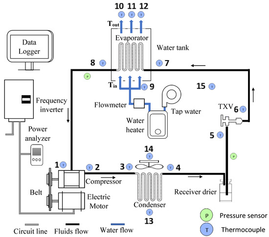 The experimental configuration consisted of the original components of the compact car’s AAC system. The driver, with its control system, the water bath system for the evaporator, the piping system, and other measurement equipment, comprised the bench configuration of the refrigeration system. The compressor, condenser, evaporator, expansion valve, and receiver drier are the essential components of the AAC system. The fixed displacement compressor is commonly used in a compact car type AAC system. The compressor has maximum refrigeration capacities of up to 1.2 kW. The water bath system was a properly insulated 60 liter water tank with a water inlet and outlet for the purpose of the evaporator calorimetric system. The insulated expansion valve and the evaporator were placed inside the tank. The cooling capacity and the mass flow rate of the system were determined using the evaporator calorimetric method in accordance with ASHRAE Standard 41.9 (2000). The inverter frequency controller and the electrical motor were used by the driver with the control system. A 4 kW capacity frequency inverter was employed to run the electrical motor and control the compressor revolution speed. A 2.2 kW 3-phase induction motor drives the compressor via a belting system. The maximum speed of the motor was 2850 rpm. A 3-phase power analyzer from Lutron (model DW-6092) was used to measure the electrical power characteristics and power consumption of the induction motor to drive the compressor. The instrumentation was controlled by a datalogger, which included flow rate sensors, thermocouples, and pressure sensors. The datalogger consisted of a datalogger integrated with 16 channels of the temperature measurements. The 16 channels datalogger represent 16 thermocouple points of measurement as shown in Figure 3. All of the readings were stored automatically in the datalogger. Figure 3 depicts the schematic design of the AAC system bench and Figure 4 shows the AAC system configurations. The Sanden SWJ-7B08 compressor runs on the R134a refrigerant and is lubricated using PAG lubricants. The nanolubricants lubricate the compressor bearings and other moving parts and are carried through the compressor by the refrigerant, where they circulate with the refrigerant throughout the entire system.