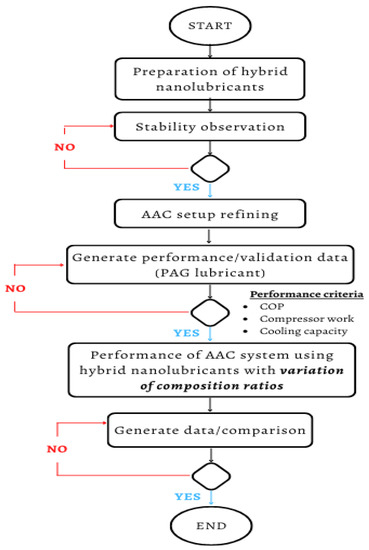 Prior to the AAC system trials, the thermocouple, pressure gauge, and flow meter were calibrated in the current investigation. Calibration of the thermocouple, pressure gauge, and flow meter were performed in the present study prior to the AAC system experiments. In this experiment, a K-type thermocouple with a diameter of 0.3 mm and a temperature range of −40 to 375 °C with a tolerance of 1.5 °C was used to monitor the temperature. This was calibrated using the Standard Platinum Resistance Thermometer (SPRT). A K-type thermocouple was chosen because it can tolerate a large temperature range (0 and 1260 °C) and has great oxidation and acidity tolerance due to its material type (chromel and alumel). Similar sensor calibrations were also performed by previous researchers [29,41,42]. The thermocouples (T1–T8) were used to measure the entering and exiting temperature of the refrigerants for each of the four main components of the AAC system. In addition, the thermocouple monitored the temperature of the inlet (Tin) and outlet (Tout) of the water bath and the ambient temperature (Tamb). Table 4 summarizes the list of sensors and equipment with their uncertainty values. The overall flow chart of the AAC system test run using hybrid nanolubricants with different composition ratios is shown in Figure 5.