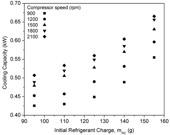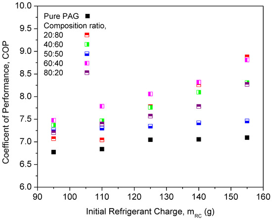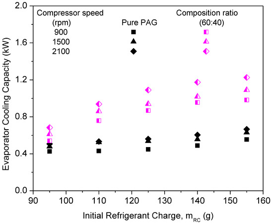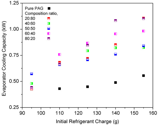 Figure 9 depicts the cooling capacity of various composition ratios of Al2O3-SiO2/PAG against the initial refrigerant charge at 900 rpm. The cooling capacity of hybrid nanolubricants increased along with the increase in the initial refrigerant charge. It was discovered that Al2O3-SiO2/PAG lubricants had a better cooling capability than the pure PAG lubricants. This is because the nanoparticles in hybrid nanolubricants help to improve heat transmission, causing the heat transfer in the evaporator to increase. Moreover, with the addition of nanoparticles in the lubricants, the decrement in the heat transfer coefficient can be avoided in the evaporator [50]. The Al2O3-SiO2/PAG hybrid nanolubricants have better thermal physical properties than the PAG lubricant [51]. The nanoparticles in hybrid nanolubricants improve heat transmission, resulting in an increase in heat transfer in the evaporator. Consequently, there is a correlation between the thermal conductivity and the composition ratios of the hybrid nanolubricants, and cooling capacity enhancements can be attributed to this correlation. The highest cooling capacity enhancement was achieved for the 80:20 ratio with 75.84% improvement for the hybrid nanolubricants compared to the pure PAG lubricants. The cooling capacity at the 60:40 ratio was enhanced up to 70.94% and higher than the 20:80 ratio. However, the 50:50 ratio showed an improvement of 45.40% and found the lowest cooling capacity enhancement. The composition ratio with more than 50% Al2O3 nanoparticles contributed to high cooling capacity enhancements up to 70%.