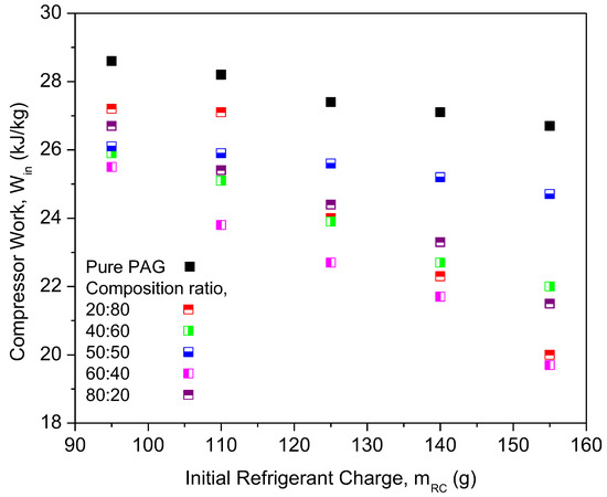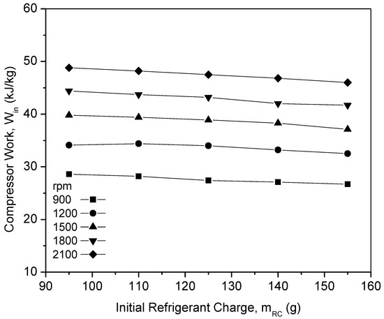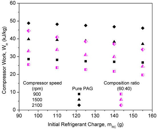 Compressor work of PAG at various refrigerant charges and compressor speeds.