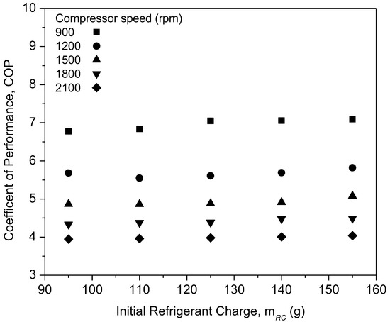 Figure 7 shows the graph of the compressor work of PAG against refrigerant charges with a variation in the compressor speeds. From the graph, the compressor work of pure PAG lubricants showed a small decrease in the compressor work with an increase in the initial refrigerant mass. However, the compressor work increased with the increase in speed. This was due to increments in the discharge temperature and pressure at the compressor along with the increasing compressor speed. Therefore, increasing the enthalpy difference will result in an increment in the compressor work. When operating at higher speeds, compressors typically exert a much greater amount of effort than when operating at lower speeds. Thus, this will also lead to a decrease in the efficiency of the system. A similar trend was observed for the compressor work in the literature [46,47]. Figure 8 shows the graph of the COP for the PAG based lubricants against the initial refrigerant charge. The most commonly analyzed main parameter for measuring the air-conditioning system performance is the COP [48]. With an increasing refrigerant mass and compressor speed, the system COP increases considerably. This is because of the increase in the cooling capacity, which overweighs the increment of the compressor power at the higher compressor speed and refrigerant charge. At a compressor speed of 900 rpm and a refrigerant load of 155 g, the COP reached its maximum of 7.09. However, due to limitations in the AAC setup and to avoid compressor operation overload, the AAC system was charged up to 155 g only. Overload compressor operation can lead to performance degradation within the compressor [49]. Hence, Al2O3-SiO2/PAG hybrid nanolubricants in this study were evaluated up to 155 g of refrigerant charge of the AAC system performance for further investigations.