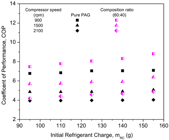 Coefficient of performance (COP) of the pure PAG at various refrigerant charges and compressor speeds.