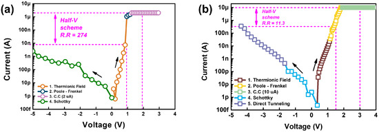 - Chen, A.; Fu, Y.; Ma, G.; Yang, G.; Liu, N.; Zhao, X.; Zhang, Z.; Tao, L.; Wan, H.; Rao, Y.; et al. The co-improvement of selectivity and uniformity on NbOx-based selector by Al-doping. IEEE Electron Device Lett. 2022, 43, 21728876. [Google Scholar] [CrossRef]