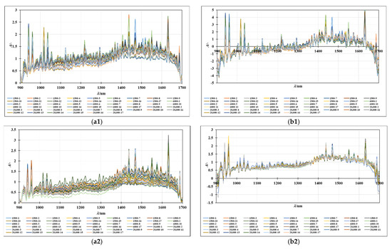 (a) Raw spectra of (a1) oil-in-water and (a2) oil-in-mint aqueous extracts. (b) (b1) SNV preprocessed spectra of oil-in-water emulsions and (b2) MSC preprocessed spectra of oil-in-mint aqueous extract emulsions.