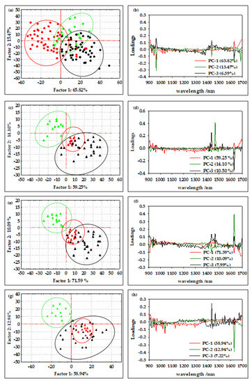 PEG 20,000). (b) PCA loading of all average oil-in-water emulsion NIR spectra after SNV preprocessing. PCA score plot of NIR spectra of oil-in-water emulsion NIR spectra after SNV preprocessing with (c) PEG 1500, (e) PEG 6000, and (g) PEG 20,000 (