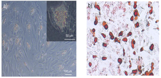 Differentiation of hMSCs into the adipogenic lineage. (a) Lipid droplets accumulated in maturated adipocytes. (b) Oil red O staining of hMSC-derived adipocyte.