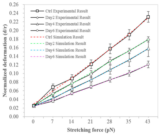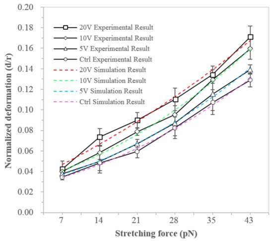 We further examined the change in the mechanical property of NB4 cells treated by electric stimulation. Through stretching cells with optical tweezers, the stiffness of cells treated by electric stimulation, with voltages of 5 V, 10 V, and 20 V, respectively, were measured and compared with the control group. Figure 4 illustrated the force-deformation relationship obtained by both experimental and modeling studies, where the normalized deformation of electric filed treated cells was larger than the control group under the same stretching force (p < 0.01), indicating the decrease of NB4 cell stiffness after electric treatment [30]. The modeling results of NB4 cells have a good match with the experimental results. Through fitting modeling results into the experimental results, the estimated actin cytoskeleton parameters could be extracted, as given in Table 2.