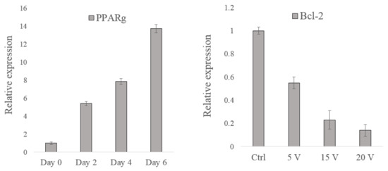 Figure 5 illustrates the gene expression results of the two case studies. The PPARg expression increased as the time the hMSCs were in the induction medium was prolonged, indicating that the adipocyte differentiation level of the hMSCs was enhanced. The Bcl-2 expression decreased as the applied electric stimulation voltage increased, implying that the cell apoptosis level increased. These results revealed that the biological properties of the cells changed after they were treated.