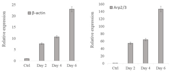Figure 6a,b illustrate the actin-based gene expression results for two case studies, where the expression of β-actin and actin-related proteins, such as Arp2/3, and Rho GTPase family (e.g., RhoA and Rac1), were tested. For hMSCs (Figure 6a), compared with the control group, the expression of β-actin, Arp2/3, and Rac1 considerably increased after treatment, while the expression of RhoA did not increase. The β-actin expression increased from days 0 to 6. The Rac1 and Arp2/3 expression levels also generally increased from days 0 to 6, but the Rac1 expression slightly decreased on day 4. The RhoA expression exhibited no obvious change.