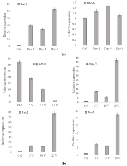 For NB4 cells (Figure 6b), the gene expression of RhoA considerably increased after treatment compared with the control group. The β-actin expression decreased as the applied voltage increased. The Rac1 expression increased from 0 V to 5 V, remained unchanged from 5 V to 10 V, and remarkably increased from 10 V to 20 V. The expression levels of both RhoA and Arp2/3 increased and decreased when the voltage increased from 0 V to 10 V. These expression levels sharply increased when the voltage increased from 10 V to 20 V.