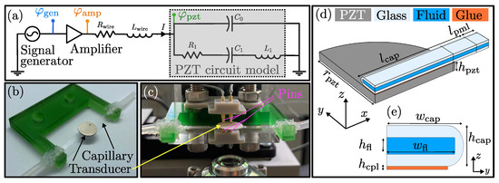 In this work, an acoustofluidic device is used, that consists of a 483--high, 2324--wide, and 50.9-mm-long glass capillary (VitroTubes, VitroCOM, Mountain Lakes, NJ, USA) containing a 200 high and 2.06 mm wide microchannel. The device is glued to a cylindrical piezoelectric transducer disk (Pz27, Meggitt A/S, Kvistgaard, Denmark), made from PZT, of thickness and diameter 10.045 mm with a nominal resonance frequency at around 4 MHz. The capillary tube is glued to the transducer by a thin () layer of UV-curable glue (NOA 86H, Norland Products, Jamesburg, NJ, USA). An overview of the device is shown in Figure 1b. Using silicone glue, the device is mounted on a 3D-printed sample holder, and rubber tubing is glued to the glass capillary tube on both ends. The electrical connection to the piezoelectric transducer is made via four spring-loaded pins, as can be seen in Figure 1c. These pins both minimize the clamping force on the transducer and enable four-probe measurement of the electric voltage across the transducer.