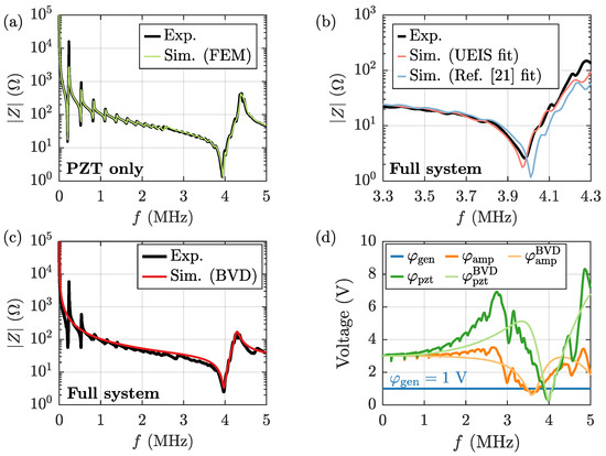 (a) Measured (black) and simulated (green) electrical impedance spectrum in the frequency range 0.5–5000 kHz of the unloaded Pz27 disk. (b) Measured (black) and simulated for 3.3–4.3 MHz, using either UEIS fitted parameters (red) or the parameters from Ref. [21] (blue) of the full system consisting of Pz27 disk, glue layer and liquid-filled glass capillary tube. (c) The measured (black) for 0.5–5000 kHz of the full system (Pz27 disk, glue layer, and liquid-filled glass capillary tube), and the computed (red) based on the single-frequency BVD-model of Section 2.4. (d) The three measured voltage amplitudes versus frequency f at different points in the circuit: (dark-green) obtained by four-probe measurements directly across the piezoelectric transducer, (dark-orange) measured at the output of the amplifier, (dark-blue) measured at the signal generator. Shown also are the two LTspice-simulated voltage amplitudes: (light green) and (light orange) computed from the BVD-model.