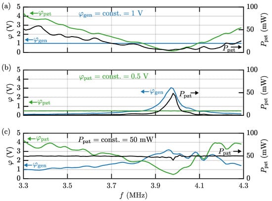 The first case with constant V is shown in Figure 3a. It is seen that and are minimal at or close to the transducer impedance minimum at MHz. This is not an ideal situation, because many systems are designed with a resonance close to the nominal transducer resonance in mind. Instead, it is beneficial to stabilize either or .
