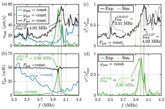 In Figure 4c using constant , the measured and the simulated average acoustophoretic speed, normalized by the measured maximum speed , are plotted versus frequency for 3.3–4.3 MHz. The agreement between the two curves is good, and they both show a resonance at nearly the same frequency MHz and MHz, respectively. A similar plot is shown in Figure 4d, but now for the case of constant , namely the measured and the simulated versus frequency with the same normalization as before. Again, the agreement between simulation and experiment is good, and both curves have a maximum at MHz, about 50 kHz lower than the constant-power resonance frequency MHz.