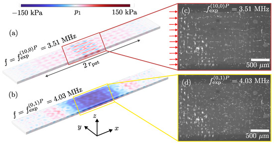 In the simulation and experiment with constant , see Figure 4a,c, a local maximum in the average particle speed v is observed at MHz. In Figure 5a,b we compare the simulated pressure field at this frequency with the simulation results at MHz. Images of the particles after 4 s at the two corresponding frequencies are shown in Figure 5c,d. Both in the numerically simulated pressure field, as well as in the measured particle positions, we observe in the x-y plane at MHz, the formation of 10 nodal lines parallel to the tube axis along the x direction, and with an equidistant distribution across the width, see Figure 5c. In contrast, at the main resonance at MHz shown in Figure 5d, we observe particle focusing in the x-y center plane of the glass capillary tube, above the center region of the Pz27 transducer, caused by the standing half-wave in the vertical z-direction. No transverse nodal lines are observed here.
