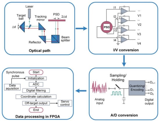 Dong et al. proposed a high-precision miss distance measurement system using a PSD (SiTek, 2L10_SU7) to replace QD [,]. The block diagram of system is shown in Figure 3, which mainly includes a front-end optical path, PSD and its signal processing circuit and a back-end data processing module. In order to achieve precise and stable miss distance measurement, the system is carefully designed in both hardware and software. In terms of hardware design, a filter capacitor network is developed to suppress the power ripple. The input of the operational amplifier is separated from a large voltage on the PCB to ensure the weak photocurrent can be detected. In terms of software design, arithmetic average filtering and median filtering are used to reduce the noise of sampled data. The PSD-based miss distance measurement system showed a repeatability accuracy with greater than ±2 μm within an area of 4 × 4 mm2, which is better than QD-based system in terms of both accuracy and measurement range.