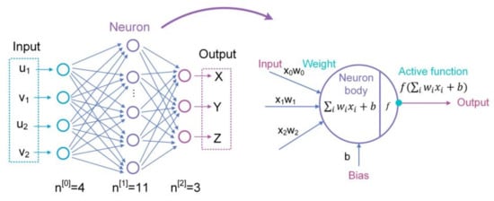 A back propagation (BP) neural network, which is skilled in dealing with systems that are difficult to describe with an accurate mathematical model, has been widely incorporated into the binocular vison systems to deal with non-linearity factors [,,]. Wang et al. built a high precision binocular vision localization system using a back propagation (BP) neural network []. As shown in Figure 5, the dual-PSD readings and are used as the input values, then the target coordinates can be obtained from the output of the BP neural network. Genetic algorithm (GA) is also used to provide optimized initial parameters as the starting point of BP iteration process. The final BP neural network has a three-layer network structure with a single hidden layer consisting of 11 neurons. After being trained by Levenberg-Marquardt optimization method, the BP neural network can measure the target with an accuracy of 1.66 mm within motion space range to 300 × 300 × 200 mm3.
