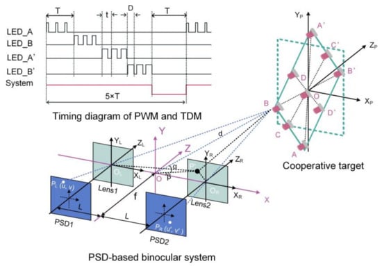Digital photography technology is another high-precision posture measurement method in large equipment assembly, which can be divided into monocular vison and binocular vision. Monocular vison can only measure the two-dimensional information of the target, which limits its application. By contrast, binocular vision can perform 3D measurement with simple structure and large measurement range, making it become the major method in digital photography technology [,]. Charge coupled device (CCD) has been widely adopted in binocular vision systems, but it is not possible to be both accurate and fast, and is also vulnerable to the change of ambient light []. PSD is expected to be more appropriate in some binocular systems since it can operate at extremely high speed without deteriorating accuracy. In addition, PSD-based binocular systems can get rid of the complex image processing tasks and enhance the measurement stability.