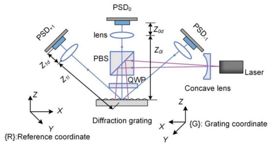 Kim et al. proposed a 6-DOF posture measurement system using a circular diffraction grating []. The system is symmetrical as shown in Figure 7. The ray emitted from the laser source is vertically incident on the diffraction grating. The diffraction grating generates +1, 0, and −1-order diffracted rays, which then reach on the surfaces of three PSDs. and represent the distance from the lenses to the diffraction grating of 0 and +1 order rays. and represent the distance from the PSDs to the lenses of 0 and +1 order rays. The design parameters of −1 order ray have the same values with +1 order ray due to symmetry. The 6-DOF posture of the diffraction grating is calculated by kinematic analysis, and the coordinate transformation matrix is derived from the coordinates of the diffracted rays on the PSDs using a numerical iterative algorithm. The experiment verified that the translation accuracy was ±10 μm and the rotation accuracy was ±0.012°. The repeatability of translation and rotation were 10 μm and 0.01°, respectively. The translation measurement range was ±1 mm, and the measurement range of roll, pitch and yaw were ±0.54°, ±0.39°, and ±1.64°, respectively.