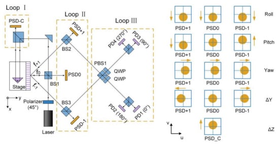 By adding comprehensive optical analysis, Lee et al. constructed a high-resolution optical encoder for 6-DOF motion measurement applying for an ultraprecision linear stage []. The proposed system consists of four PSDs, four photodiodes (PDs), a diffractive linear grating and some auxiliary optics components. The overall system configuration can be divided into three loops: Loop Ⅰ measures ΔZ using PSD_C; Loop Ⅱ measures ΔY, pitch, yaw and roll by three separate PSDs together with a diffractive linear grating; Loop Ⅲ measures ΔX by four PDs. The linear stage motion brought about changes of beam positions on the four PSDs are illustrated in Figure 8. Kinematic analysis is used to decouple the 5-DOF motion, namely, ΔY, ΔZ, pitch, yaw and roll, from the respective beam changes on the four PSDs. The measurement of ΔX is based on the circularly polarizing interferometric technique (CPIT) in a robust manner. In the experiments, the resolution of PSD was evaluated to be better than 0.03″ in rotation and 20 nm in translation. The achieved resolution of the proposed optical encoder was 0.03″ for pitch, yaw and roll, 0.4 nm for ΔX and 20 nm for ΔY and ΔZ.