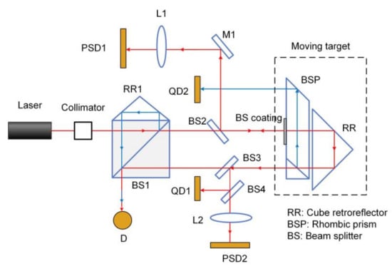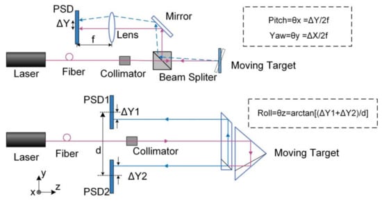 Among these three technologies, laser tracking and digital photography are superior to indoor GPS in terms of measurement accuracy, and these two technologies both utilize PSDs as key elements. In the area of ultra-precision manufacturing, 6-DOF measurement is intended for calibrating the geometric motion error of the linear guide. The most representative instrument for accurate calibration is laser interferometer []. However, the laser interferometer has three major disadvantages. Firstly, any variations in the testing environment that affect the laser wavelength (such as temperature, pressure and humidity, etc.) will seriously reduce the measurement accuracy. Secondly, the laser interferometer cannot self-recover from interruptions (such as beam blockage, loss of light, etc.), causing difficulties in measuring over long time periods []. Lastly, the system will be rather complex when using laser interferometers to implement simultaneous measurement of 6-DOF motion [,]. In contrast, PSDs are insensitive to pressure or humidity variations and capable of detecting discontinuous or pulsed light, thus are very suitable for calibrating the linear stage with high efficiency, high stability and easy system configurations. In addition to the two previously mentioned fields, research into 6-DOF measurement also exists in other emerging areas such as space station experiments, indoor positioning and so on. These areas require diversified and customized 6-DOF measurement schemes. By taking PSDs and optics as basic building blocks, various measurement systems can be created to flexibly meet the specific requirements.