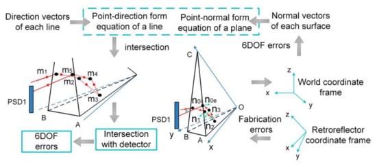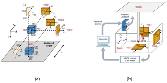 To overcome the challenges mentioned above, it is crucial to select appropriate sensors, as sensors play a critical role to provide signals related to the target movement and determine the performance limits of the integrated system. Position sensitive detector (PSD) is particularly well-suited for measuring posture due to its outstanding accuracy, excellent resolution, superior speed and simple signal processing [,,]. To date, PSD-based 6-DOF posture measurement systems have been extensively studied and much valuable work has been reported.